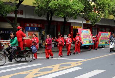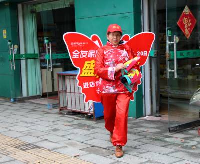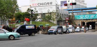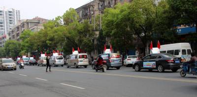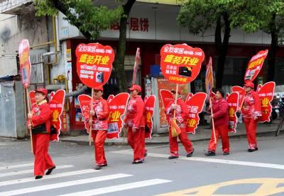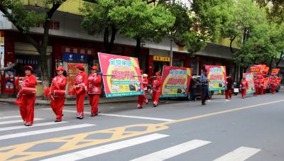 2015年4月20日,云梦县城区各种促销的队伍。五一假期临近,商家多种促销方式在城乡上演,各商家使出浑身解数,开展节日促销活动。