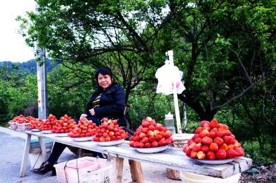 4月21日,十堰市郧阳区柳陂镇挖断岗村至十堰市区209国道沿线,村民们已在路边摆起了草莓地摊,每斤10元钱的价格吸引着过往车辆停下购买。目前郧阳区建成生态观光产业基地8万亩,开发区的樱桃沟、柳陂镇梯子沟村、王家学,马蹄沟等10多个村成为小水果示范村。 视界网周家山 王燕摄