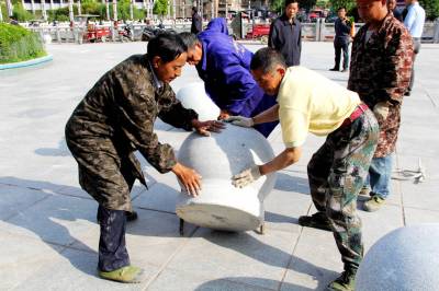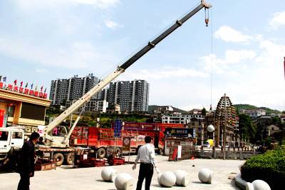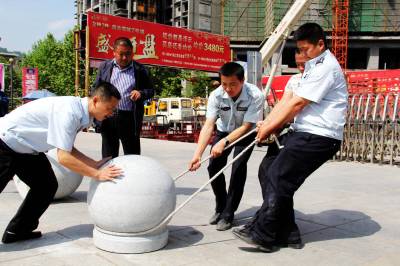 4月21日,宣恩县城管局市政工作人员正在将挡车球在河滨广场进行规范、有序的摆放。 据悉:为加强广场内的车辆违规停靠管理,给市民创造广场休闲娱乐的通畅环境,该县城管局将河滨广场人行道主要进出口摆放了80个挡车球,有效的治理了车辆广场违规停靠问题。 (本报视界网:罗清峰摄)