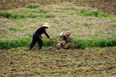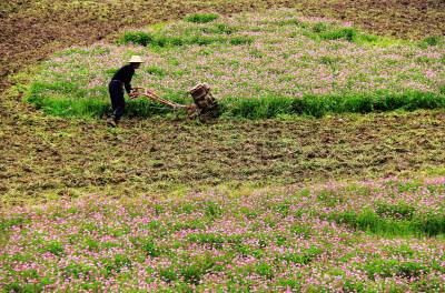 4月22日,竹山县宝丰镇双河村二组一村民正在用微耕机把人工种植的紫云英深翻肥田。近年来,该县充分利用冬闲资源和山场资源,鼓励退耕还草,因地制宜种植紫云英、苇状羊茅、紫花苜蓿、白三叶、黑麦、鸭茅等优质草种,扩大种草面积,推广种草肥田、种草养畜等项目,达到增粮、增草、增畜、增肥、增收的效果。