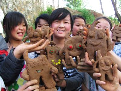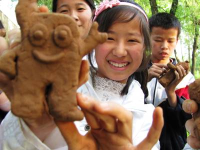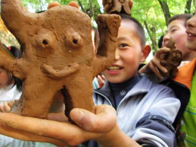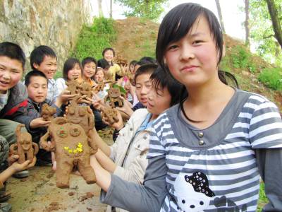 5月19日,湖北郧县刘洞镇初级中学的学生在泥塑课上正向老师展示自己所捏的海宝。随着世博会的召开和动画片《海宝来了》的热播,许多学生对世博会吉祥物海宝有了深刻的认识。在当天的室外泥塑课上,学生们都捏出了自己心中的海宝形像,共同表达了对世博会的关注,对动画片中代表智慧和正义的化身的海宝的崇拜。