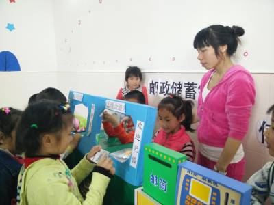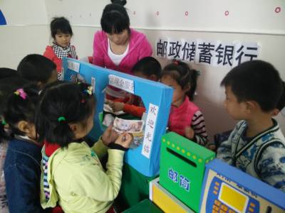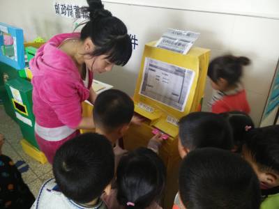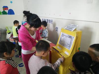 自动存取款机在社会生活中随处可见,有些幼儿经常跟随父母去银行取钱,所以他们对自动取款机都比较熟悉。利用废旧的饼干盒、彩色纸、透明胶带制作成银行柜面业务办理和自助式取款机道具,为孩子从小养成良好的金融理财能力提供了表象认识。