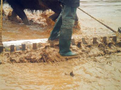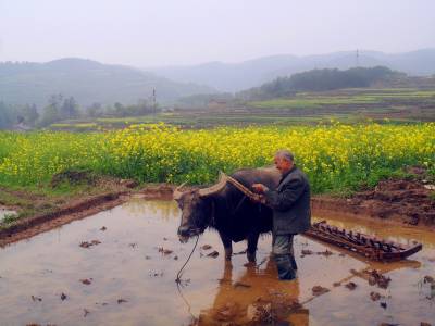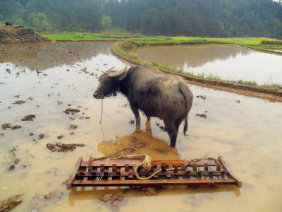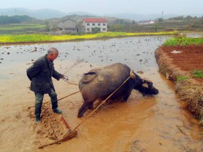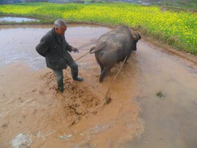 压坯是农人整水田插秧不可缺少的环节,其作用是把翻耕出来的泥砣土块压入水中浸泡变软,把田中高处的泥巴赶到低处,使田面平整,以免插秧后高处的秧苗干死,低处的秧苗淹死,还便于耕整第二道田后赶耖,然后插秧。压坯使用的工具是抓耙,由两根长5尺宽4寸厚8分的坚硬木方、一对长2.1尺宽3寸的泅水、一根刺柏树做成的能转动的轴、轴上有坚硬的45根长8寸多宽1.6寸的木齿和一对轴承组成。压坯时,人站在抓耙两根木方踏脚上,驱牛拖着向前,中间旋转的耙齿便将田里的土块泥砣抓碎,压入水中浸泡。每块田先抓一遍横耙,再抓一遍直耙。2000年以后,宜昌市夷陵区分乡镇农家逐渐使用微型耕整机耕田压坯,传统木耙压坯方式快速消失。2015年,仅1﹪的农家传承木耙压坯习俗。(视界网 袁国悦摄)