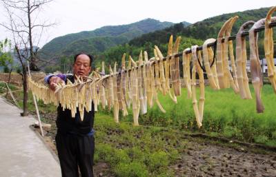 竹农发竹财 (图文) 竹山县宝丰镇中心学校 朱本双 电话:13177481456 邮编:442213 电子信箱:zsbfzbs@126.com 4月22日,竹山县宝丰镇双河村一组竹农刘长海正在晾晒竹笋。近年来,该县因地制宜选择楠竹、雷竹等笋竹两用林新品种,在盛产山竹村加大改造和新植竹林。目前,全县笋竹基地规模达到50万亩,仅此一项当地10余万竹农人均增收200多元。