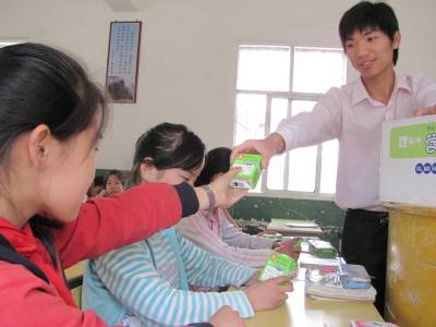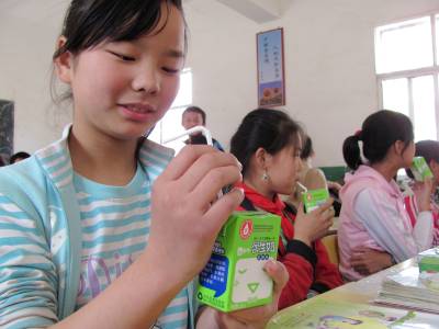 5月20日,郧县刘洞镇中心小学的教师正在给学生发放”学生饮用奶”。为改善学生营养,增强学生体质,确保学生在校期间每天喝上一盒奶,今年以来,国家”学生饮用奶计划”在郧县中小学全面展开。