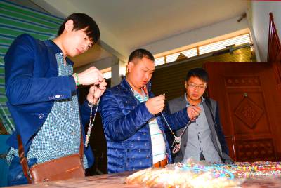 来凤“民族情”引来山外客 4月23日,一名武汉客商(左一)正在来凤县龙凤手镯饰品公司洽谈订货业务。鄂西山区的来凤县土家族苗族自治县自古以来是土家族聚居的地方,随着“仙佛寺”、“摆手舞”两张旅游名片唱响,该公司各类土家族风格的手镯、项链、耳环等手工艺品畅销山外。 视界网 张友胜 摄