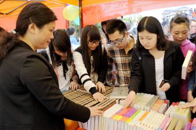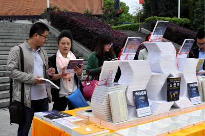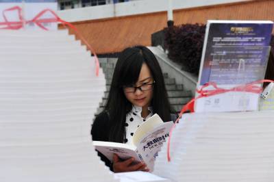 4月25日,湖北民族学院,几位市民正在阅读推荐书籍。 当天,“书香荆楚,文化恩施”全民阅读活动在恩施市正式启动,该市围绕围绕“沐浴书香、建成支点”这个主题,开展了优秀书目推荐、图书展销,拒绝盗版、大家一起来读书大型签名等系列活动,1000多名学生和市民参加了启动仪式。(视界网 童秀清摄)