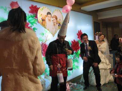 前天,笔者参加一个朋友的婚礼时,看到了特别搞笑的一幕:新郎的父母亲被他们的同事朋友强行戴上写有搞笑文字的高帽,脖子上挂着写着醋字的饮料瓶,还系上围裙。顿时全场宾朋欢声雷动,场面极热闹,就连新郎新娘也哈哈大笑起来。荆州红门路29号刘传池摄邮编434000