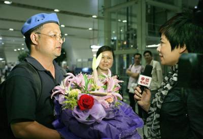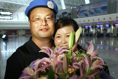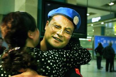 5月21日凌晨2点,前往利比里亚执行国际维和任务的我市民警汤文和,辗转50多个小时,终于回到阔别16个月的家乡孝感。现年41岁的汤文和是孝感市公安局出入境管理科副科长。2005年7月,汤文和经过层层选拔和培训,曾被派往利比里亚执行为期1年的国际维和任务。2009年1月,汤文和二度出征非洲到利比里亚执行为期一年的联合国维和任务,任驻利比里亚维和中国警队副队长。今年1月6日,汤文和被授予联合国”和平勋章”。因出色的表现和任务需要,汤文和在危险而艰苦的利比里亚延期执行维和任务4个月。据悉,汤文和是建国以来孝感市第一位奉命出国执行维和任务的民警,也是迄今湖北省唯一2名两次被国家派往国外参加维和任务的人民警察之一。晏美华摄
