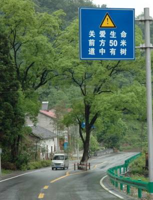 警示涂在树杆上 5月21日,在连接武当山至神农架的武神生态旅游公路房县杜川段,一棵长在路中间两人合围粗的大树前50米处拍摄的警示牌。 据悉施工人员不仅没有砍掉这棵树,还在树干涂抹着红白相间的警示标志。在设计、施工时,也最大限度地减少对生态环境的破坏,力争将武神公路打造成一条科技生态环保旅游公路。