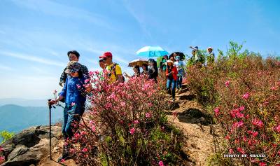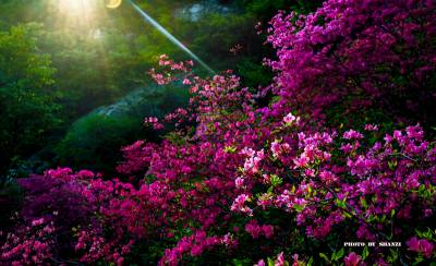 与其他景区的杜鹃群落不同,天马寨杜鹃花海虽然还是以红色为主打,但走进花海中间,才更能被这里杜鹃的魅力所震撼:天马寨上的杜鹃,生得从容,开得恣意,或 依附于杂乱的怪石之间,或红紫相间,或与一些灿烂的野花作伴,它们扎堆成片,顽强的枝干或疏斜,或丛生,棵与棵相互扶持,枝与枝彼此并肩,朵与朵笑脸挨着 笑脸,绽放着各自的灿烂。共同在最自然的天地汇成一片宛若仙境的海洋。人在花间走,如在花海游。淡淡的花香涤荡着心神,让人如痴如醉。
