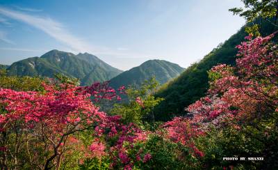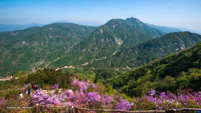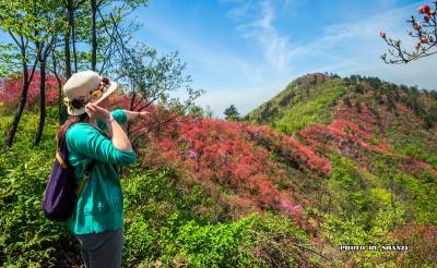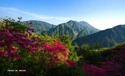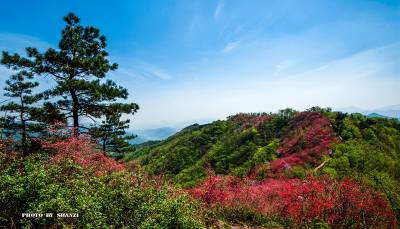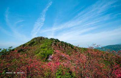 人间四月芳菲尽,天马寨上花成海。四月以来,英山县雷家店镇上沟村境内的天马寨上,五彩杜鹃沿着海拔高度梯次盛开,进入下旬,盛开的杜鹃开遍整个山脉的大小山脊,让染上新绿的群山披上绵延十里的红色脊梁,蔚为壮观。