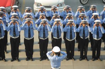 5月23日,30名统一着装的交通协警队员在宜昌市西陵区各重要交通路口上岗值勤,过是散乱的协警队伍变成了”专业班子”。随着近年宜昌经济的高速发展,城市车辆不断增加,道路交通管理工作的难度越来越大,为弥补一线交通民警警力不足的现状,宜昌交警部门通过保安公司面向社会招募交通协警员,协助交通民警上路值勤,从而实现强化路面管理的目的。记者刘曙松摄