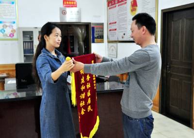 5月1日,松滋市刘家场镇外出打工青年刘佳将一面印有“服务社区居民,构建和谐社会”的红色锦旗从广州专程送到家乡柳林河社区主任胡颖的手中,表达她对社区领导和群众的感激之情。 张元银 杨祖明