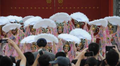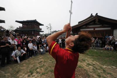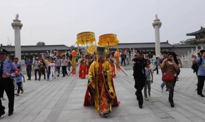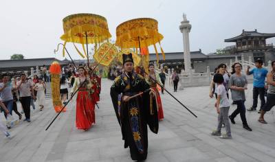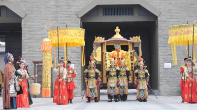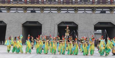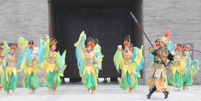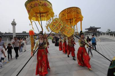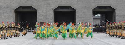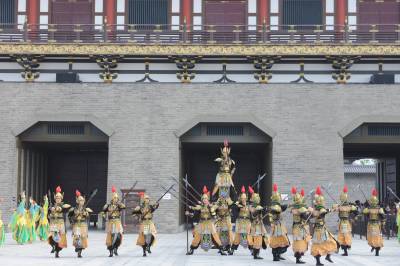 5月1日,在襄阳唐城,演员重现开唐盛世华章。当日,中国唐城影视基地开城迎客。