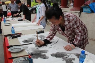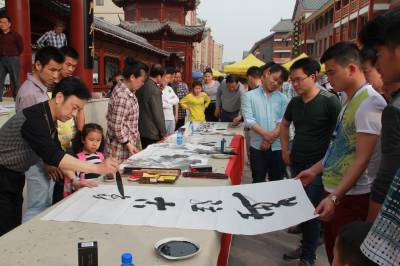 工业园区挥毫泼墨迎五一 昨日,别开生面的汉川市“迎五一书画笔会”在汉正服装工业城举行,书画家饶有兴趣地参观工业园区和商业街,并即兴而作,现场挥毫泼墨。此次笔会旨在以中国传统的书画形式颂扬劳动人民的幸福生活,向全市人民致以节日的问候,在弘扬中华民族书画艺术的同时,也为劳动者节日增添了喜庆的氛围。 视界网刘晓平摄
