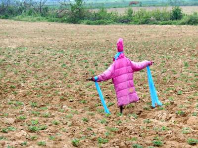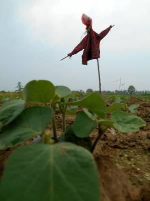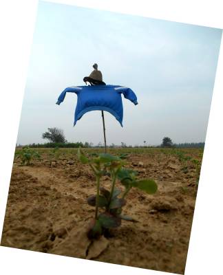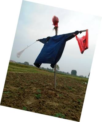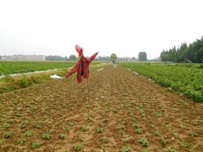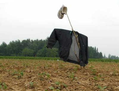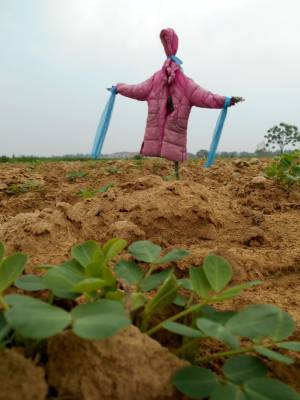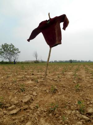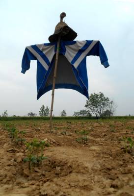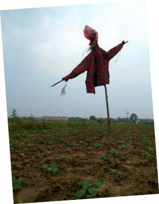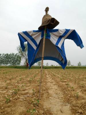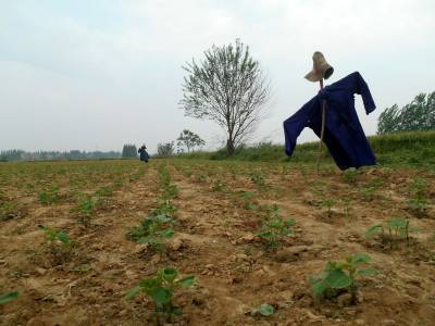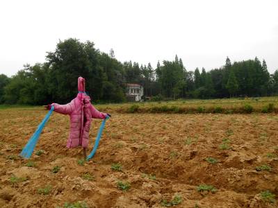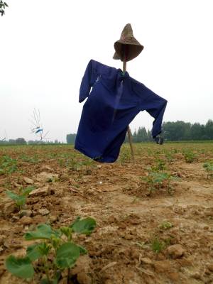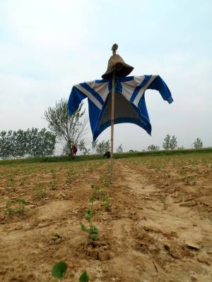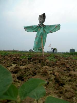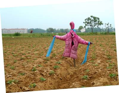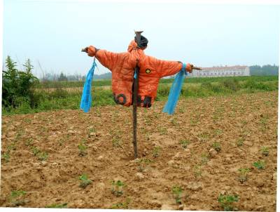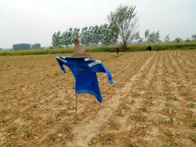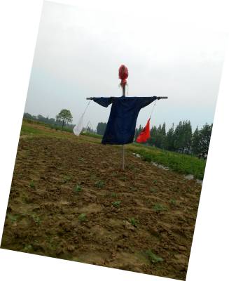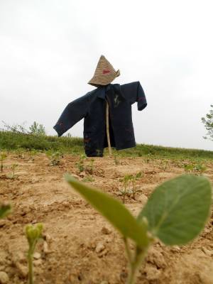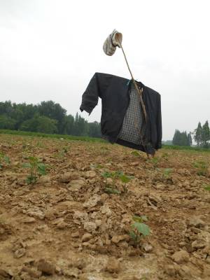 2015年5月1日,云梦县隔蒲谭镇三黄村毛豆、花生地里的稻草人。随着环境的改善,雀鸟的增多,也给农民带来新的麻烦。农民刚种到地里的毛豆、花生等种子,尤其是种子刚刚暴土出芽期,成群的鸟儿在种子地里将种子及刚要出土生长的种苗钻出、吃掉,影响种子的发芽生长。于是,农民运用古老的稻草人来驱赶鸟儿,保护种子,又不伤害鸟儿,一举多得。于是,在农田,一个个形象逼真、形态各异的稻草人在种子地站岗放哨。稻草人成为种子的保护神,受到农民的喜爱,也成为农田的一道别样风景。