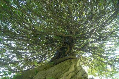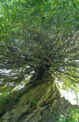 5月23日,在湖北省保康县后坪镇詹家坡村一组村民孙天培屋后拍摄的一株刺果卫茅。这棵刺果卫茅树龄在200余年,生长在大石头上,高7米,冠幅5米,由20多条6---8厘米的须根纠结成树干,就像一巨型天然树石盆景。
