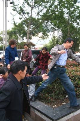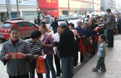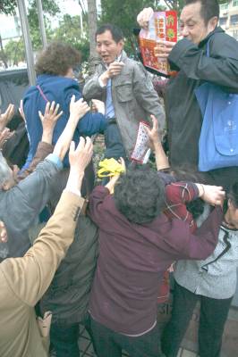 昨日上午,为了领取4个免费鸡蛋,一些老者和妇女在汉口新华下路汇济超市大药房前排起了长队(见图一)。由于赠品数量有限,未领到赠品单者将该药房员工团团围住,一时间秩序大乱(见图二)。一位王姓太婆抱怨说,她凌晨5点就来排队,但仍未领到赠品单。由于赠品单已发完,药房员工只有夺路而逃,但老人们仍紧追不放(见图三)。周围市民议论道:店家招揽顾客无可非议,但要注意活动的安全性,如果有老人在争抢中摔坏了,那就责任大了。张垠摄江汉区园林局430022