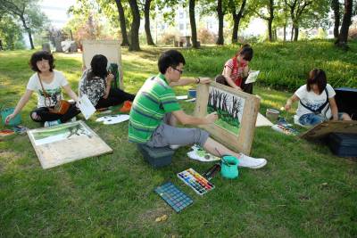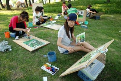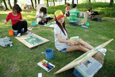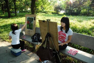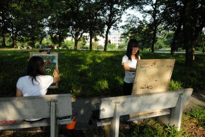 2010年5月24日,湖北经济学院艺术学院学生在校园绘画写生。连日来的阴雨过后,天空和大地格外清新,同学们用画笔描绘着阳光下怒放的小草,让校园充满生机活力。