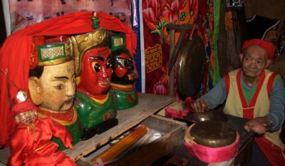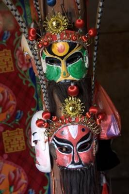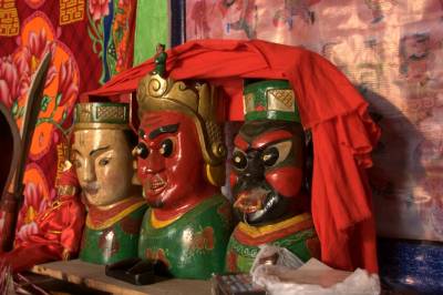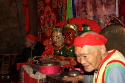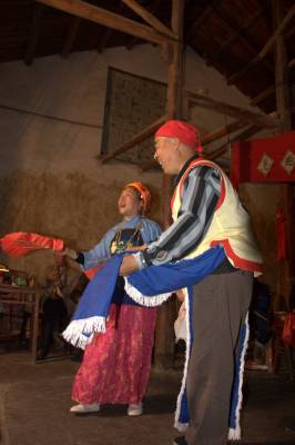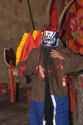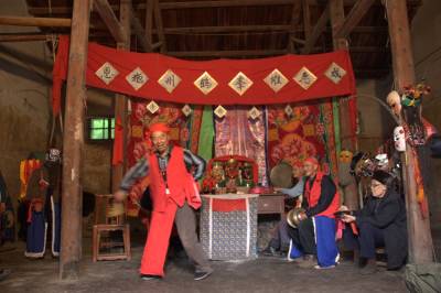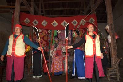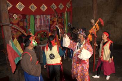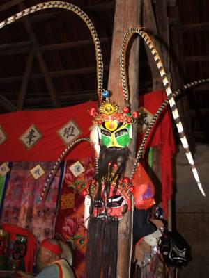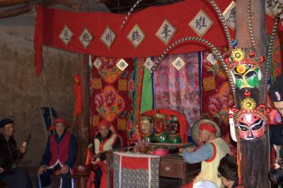 2010年5月22日,阵雨转多云。中午时分,在一阵铿锵的锣鼓声中,燕子乡傩戏传人卢碧川带领他的傩戏班子为县摄协会员们开始表演鹤峰傩愿戏。傩戏在鹤峰称为”傩愿戏”,是一种以还愿为依托、以傩坛为载体、以祭仪出现的一种戏曲艺术。 据《容美土司史料汇编·杂记志》记载:”大二三神求医问寿者、往来相属于道。神所在人康物阜,合族按户期应奉焉,期将终,具酒醴,封羊豕以祭之,名曰喜神,不然必居奇祸,祭时鼓征嘈嗥,苗歌蛮舞,如演剧然”。 鹤峰傩愿戏最早见于文字的是明朝天启年间容美土司王田玄的诗:”《澧阳口号》(田氏一家言)山鬼参差迭里歌,家家罗邦截身魔;夜深响彻呜呜号,争说邻家唱大傩”。从诗中可以看出当时傩愿戏已相当盛行。此后《宜昌府志》、《鹤峰州志》、《长乐县志》都有对鹤峰傩愿戏的记载。 鹤峰走马千金坪傩坛班主张盛鼎(1905-1984年)等艺人,于1979年回顾其师承牌位记载:”开坛启教南岳爷爷汤法胜,辰州师傅邓法刚,佛法师傅李法霖,师祖张法雷,曾祖考张法祥,祖考石法旺,恩师张法林,弟子张法龙(即张盛鼎本人),门徒李法正,门孙向绪斌等,共计10代传人。而师祖张法雷是当地农民张自成,他于清乾隆十八年出师度职后也有七代传人,按此计算,该傩坛也有300多年历史。据恩施石灰窑区傩坛艺人蒋品三等介绍,其先辈早年在鹤峰北佳乡茶园坡傩坛出师度职,回乡后已有13代传人,其历史就更长。 鹤峰傩愿戏班称坛,班主又称掌坛师。一个傩坛约8至10多人不等。解放前鹤峰约有25个傩坛,主要分布在走马、白果、锁坪、南北、阳河、铁炉、马家、五里、桃山、六峰、清湖、北佳、中营、云蒙山、邬阳等乡镇和地区。傩愿戏历代屡遭禁处,但始终相传不绝,现在鹤峰清湖、江口还有两支完整的傩坛,能完成全套演出,而且有青年人入坛,其它地方只有零散艺人。 鹤峰傩坛,所供奉的傩神主神有供两尊与三尊的两种形式。两尊者一为东山圣公(傩公),二为南山圣母(傩母),形象一红脸,一白脸;供三尊者一为九天飞齐太乙都总驱傩大帝(红脸),二是清源妙道傩神真君(黑脸),三是五通五显华光大帝(白脸)。对神像的解释又根据不同的傩坛说法不一。 土家族”傩愿戏”有一套完整的祭仪,称”二十四戏”(亦称”二十四堂法事”),具体名目为《发功曹》、《白旗扫台》、《操兵》、《迎神》、《修造》、《开山》、《打路》、《扎寨》、《请神》、《窖茶》、《开洞》、《戏猪》、《出土地》、《点猖》、《发猖》、《报卦》、《收兵》、《扫台》、《邀罡》、《祭将》、《立标》、《勾愿》、《撤寨》、《送神》。一套简约的祭仪也有”八出”,称”正八出”,具体名目为《发功曹》、《迎神》、《扫台》、《扎寨》、《开山》、《出土地》、《祭将》、《勾愿》。其形态多为妆粉角色(人、神、鬼、怪)的歌舞、百戏表演,其中的部分祭仪已同于近世戏曲的小戏。祭仪之间(一般在邀罡之后),傩坛即有所谓”正戏”演出。正戏皆为大型剧目,内容虽自成一套,然亦皆与祭仪联系紧密。有称”天、地、水、阳四大团圆”。”天团圆”演关索故事,为《鲍家庄》;”地团圆”演梁祝故事,为《双蝴蝶》;”水团圆”演龙女、柳毅故事,为《清家庄》;”阳团圆”演孟姜女、范喜良故事,为《孟姜女》(亦有说”天团圆”为《崔文瑞与张四姐》,”阳团圆”为《鲍家庄》)。 还傩愿中所用音乐,泛称傩戏音乐,大体包括法师腔、角色唱腔和锣鼓伴奏三部分。角色唱腔有正腔、小调两类。正腔类的诸种腔调,统称”打锣板”,唱腔多按角色行当赋名,称生角腔、旦角腔、净角腔、丑角腔;有些地方或以所扮角色的名称冠称,如姜女调、清婆调、梅香调、浑童调等。演唱形式为锣鼓伴奏,人声帮和。 傩戏唱腔、调式色彩比较多样,其中以落5、6、2音居多,也有上、下腔句落音相同的。唱腔节奏以记谱为2/24者为多,少数为1/4节拍或散唱。唱段中还常出现2/4和3/4拍子交替的情形。正腔中腔调词格,均以七字、十字的对偶句式为主。傩戏剧本唱词甚多,如人牧对话、剧情交待、环境介绍等,均多以唱的形式表达。唱腔无固定调高,演唱均用本嗓,风格粗犷朴实,具有山野风味。鹤峰傩愿戏充分展示了原始宗教的人神平等观念,虽然带有浓厚的宗教色彩,但”神”已人化,加上载歌载舞的艺术表演,形象夸张的面具,诙谐幽默的插科对白,饶有生活情趣的细节,在表演中有唱有帮,使演唱者与围观者产生艺术上的共鸣,思想感情上逐渐融为一体,从而得到精神上的愉悦与满足。这种具有浓厚乡土气息和民族情趣的傩愿戏,深受土家人民喜爱,有着不可替代的艺术价值。鹤峰傩愿戏富有原始色彩的内容与艺术,为我们研究中国戏剧演化史、宗教之起源,民族之形成,以及民俗学、社会学等方面提供了活生生的例证。鹤峰的兽皮傩面,在全国也不多见,它是古代巴人长期狩猎经济的产物,其独到的制作工艺与人物造型艺术,除宗教功能外,也具有很强的审美功能,被专家称为民族文化”活化石”。