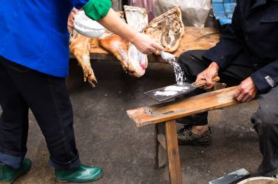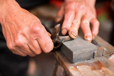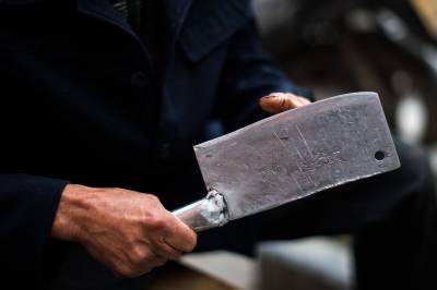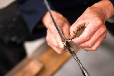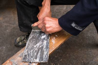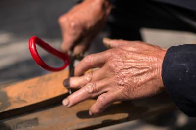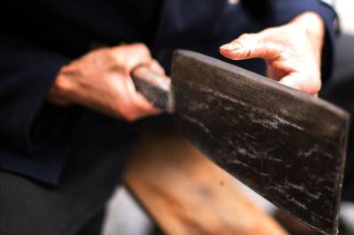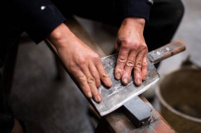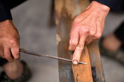 摄影时间:2015年5月6日,地点:恩施市;摄影:陈力,恩施州商务局;电话:13907269510;通讯地址:恩施市清江东路9号州商务局,445000.民俗事项说明:磨刀师傅王顺峁,恩施市三岔乡农民,今年71岁,从年轻时起就靠磨刀这项传统手工艺谋生。一支木板凳,几块磨刀石,王顺峁凭这简单的行头,在恩施市城区走街串巷40多年,为市民磨刀。他不像一般的磨刀师傅,拎着一支小喇叭喊:“磨剪子嘞呛菜刀”,就是凭着诚实、过硬的技术为市民服务。他会打磨一般家庭用的菜刀、剪刀,也会打磨商场和超市用的砍刀、绞肉刀,还会打磨医院里的各种手术刀。从某种意义上说,他可以称得了是“磨刀王”了。他是差不多快要失传了的百姓好工匠。