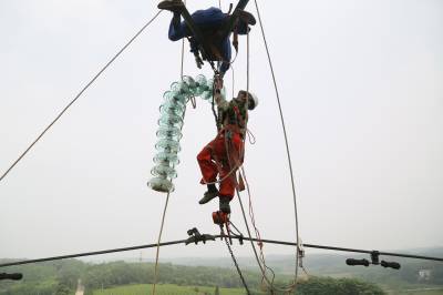 5月6日,正值立夏,国网咸宁供电公司检修人员在220千伏茶宝线上更换瓷瓶绝缘子。新更换的钢化玻璃瓷瓶具有更高的抗雷击和防污闪能力,将为夏季用电高峰提供更优良的供电保障。茶保线全长34公里,所有87基铁塔绝缘子将全部更换。(詹文峰 谌胜蓝 廖朝波)