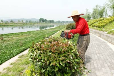 5月8日,房县河流湿地管理人员在修剪城区马栏河河流湿地景观树木。房县投资6亿多元,治理城区44公里河流湿地长廊。目前,河流湿地乔木、灌木、草甸等自然植被保护完好,水鸟等水生动植物种类丰富, 17座湿地人工湖,为蓄水排洪、调节河流径流、提高水体纳污能力,发挥着天然的“调节器”和“净化器”作用,并成为鄂西北地区最大的湿地科普宣传与教育、湿地生态旅游圣地。