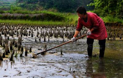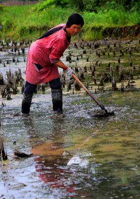 5月10日,竹溪县县河镇安家沟村村民朱秀丽在整准备插秧的水田。 “我们村近6 年来都是栽种‘免耕’秧“竹溪县河镇安家光沟村村民朱秀丽说。使用“免耕”农药稻田不长草且表面浠泥可不耕方插秧,解决了现在农耕牛少,可使牛农耕留守劳力少的农业生产矛盾。“免耕”水稻谷粒比以往三犁三耙的成熟颗粒稍小而多粒保产量(视界网温大树摄)。