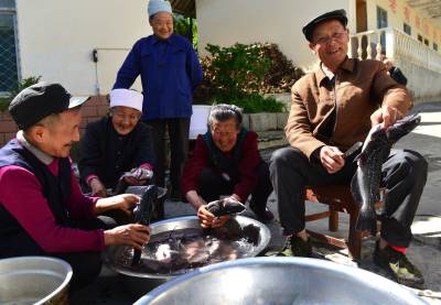 5月11日,建始县花坪镇中心福利院五保老人正宰杀清江鱼。这些年,该镇中心福利院五保老人沐浴党的好政策,加之走以副补院之路,晚年幸福生活像掉进蜜罐子一样,越过越甜。本报视界网刘波摄 建始新闻中心刘波联系电话13032794298