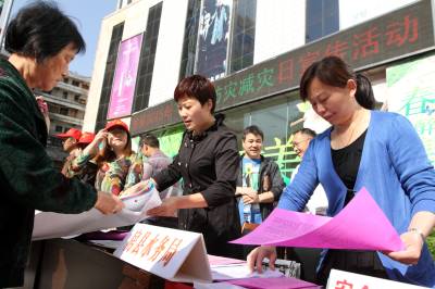 5月12日,房县水务局干部(右)在县城寿康生活广场向群众发放山洪灾害防灾减灾宣传单。房县是全省山洪灾害多发地区,为普及山洪灾害防御知识,减少人员伤亡,力避灾害造成的财产损失,2013年以来,该县向重点地区群众发放山洪灾害防灾减灾明白卡4.5万张,宣传册4.5万本,安装永久性宣传栏、警示牌240块,刷制标语100处。同时,投资1147万元,配套山洪灾害防治非工程点,完成安装20个预警广播,自动和简易雨量站201处,发放手摇报警器及铜锣106台,受益19个乡镇、129个村(居)群众。