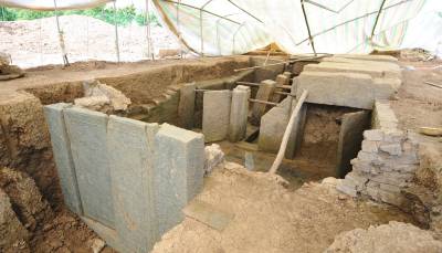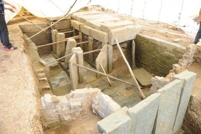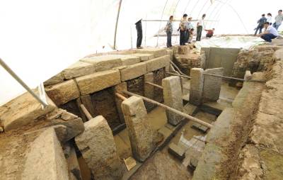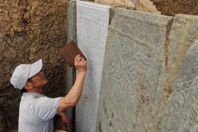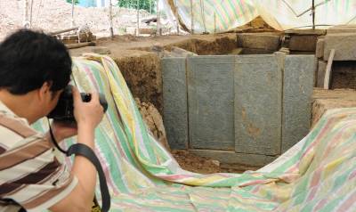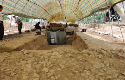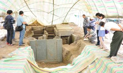 5月12日拍摄的襄阳骆台墓地汉代画像石墓。该墓葬位于襄阳市高新区团山镇蔡庄村四组骆台自然村南,西为汉江北路。2015年3月,电力部门在此开挖电缆沟时发现青砖和石构件。当地村民及时向市政府进行了报告,接报后襄阳市文物考古研究所第一时间派员赶到现场并进行处置,随后对该工地实施了文物勘探,发现汉代墓葬2座。