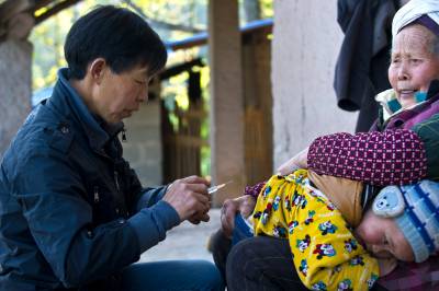他就是张爱国,中坪村卫生室医生。“那是村民彭善政的家里人在喊我。”张爱国说:“老彭73岁了,身上病多,早上打了电话叫我过去打针。现在准是看到我来了,催我呢!”