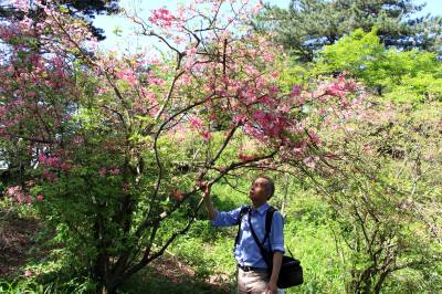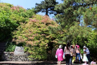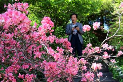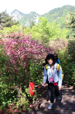 2015年5月12日,湖北省黄冈市,游人在麻城市龟峰山风景区观看杜鹃花。当日,麻城杜鹃花期虽然接近尾声,但落英缤纷,树上花开,树下落英相应成趣,依然有来自山东、广东、湖北、河南等地的游人来此游览观赏。