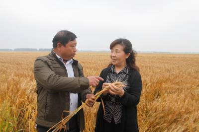 15日,在中国农谷核心区的长滩办事处张柞队,省农科院的小麦育种专家李梅芳(右)正在查看张国军种植的小麦。湖北省自育小麦良种“鄂麦596”在今年极端气候下,各方面表现再次超过外省品种。抗病性、抗倒伏、高产稳产方面均表现优异,收购价每斤1.2元,由于品质好,每斤卖价高于其它品种0.18元。按今年亩产800斤估算,张柞队3200亩小麦可实现增收46万多元。该品种在我省襄北地区的产量均在1000斤以上。 视界网 焉 潮 摄影报道
