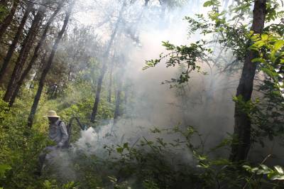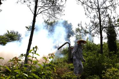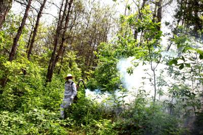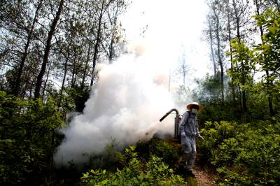 5月14日,竹山县林业局聘请房县森防站社会化防治服务队人员,会同该县擂鼓镇干部、村干部及林业站人员,前往鼓锣坪村冠马梁子,采用苯氧威加柴油混合溶液喷烟和投放1000枚白僵菌高孢粉弹进行防治。