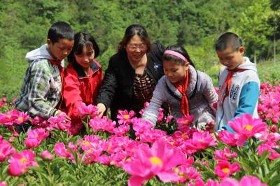 教师充当留守儿童的代理妈妈,轮流陪伴爸妈都在外地打工的孩子过节假日,这在大山深处的湖北省十堰市郧阳区鲍峡镇东河完全小学已是常态,这所小学的一百七十名学生中,百分之七十五的家长都长年在外打工,为使孩子们节假日过得安全轻松愉快,全校十六位教师轮换着到学生所在的村落,组织学生开展有趣的活动,此举深受学生家长好评和孩子们欢迎。图为东河小学的顾安芝老师在苍浪村陪几位留守儿童观赏盛开的芍药花。