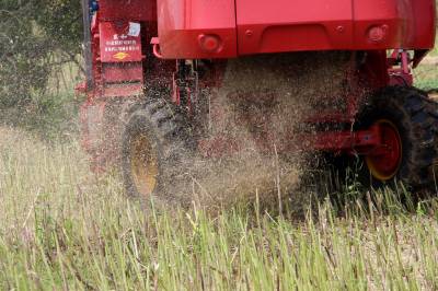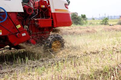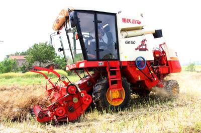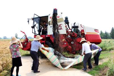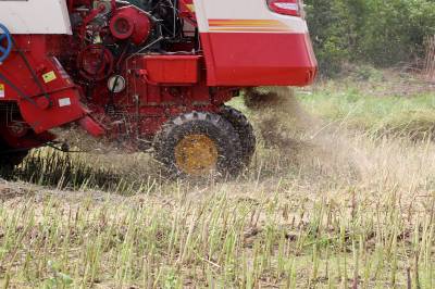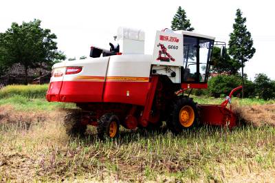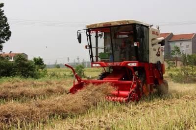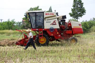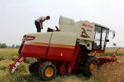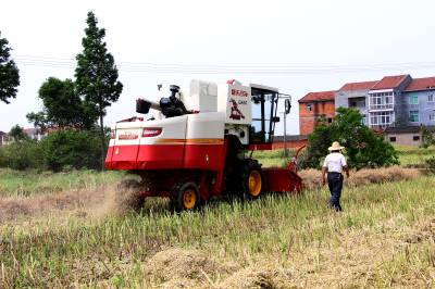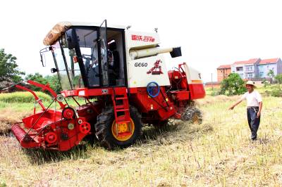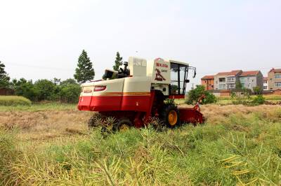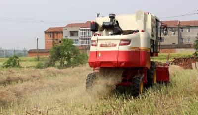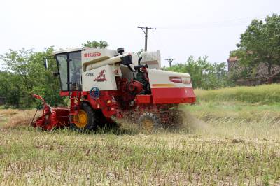 2015年5月16日,云梦县清明河乡三港村村民驾驶配有秸秆粉碎装置的收割机在地里忙着收获油菜籽,同时将油菜秸秆机械粉碎还田。