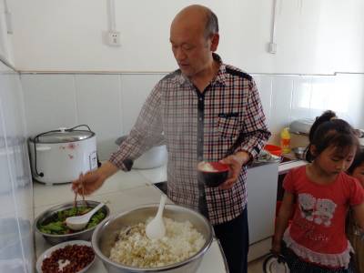 大洼教学点是幼儿班、学前班、一年级的三级复式,只有17名学生。每天,郭老师除了搞好自己的教学之外,还兼学校的保安员、炊事员、保育员和理发匠;他对待孩子就像对待自己的孙子一样,无微不至的呵护,老师和村民们喊他“万金油”老师。