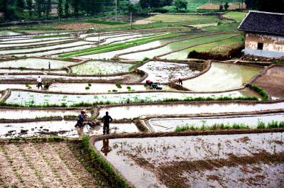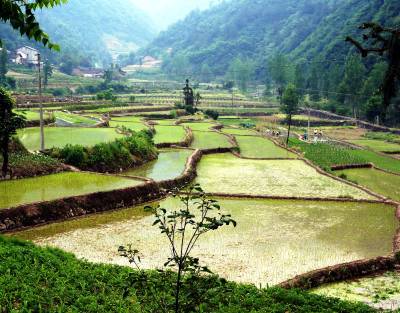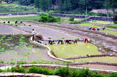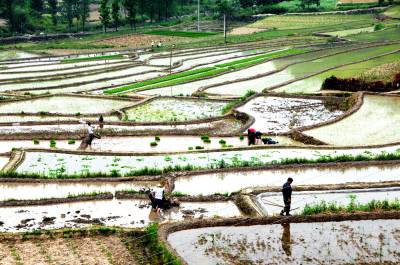 5月18日,十堰市郧阳区鲍峡镇高桥村村民正在水田里插种胭脂米稻秧。由于胭脂米是古代贡品,生长在700米至900米的海拔高度上,使用山泉水和农家肥,亩产在400斤左右。自审报地标农产品后每斤胭脂米价格长至200元1斤。今年鲍峡镇将胭脂米扩大为1000亩种植规模,以满足市场需求。 视界网周家山 摄