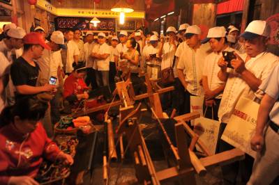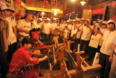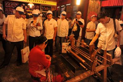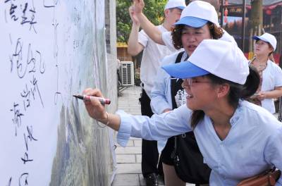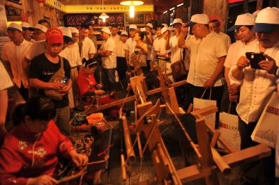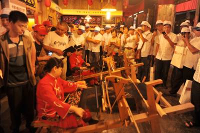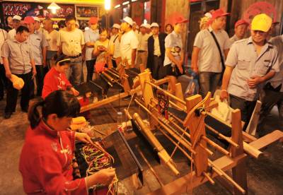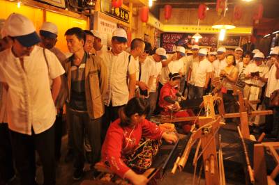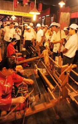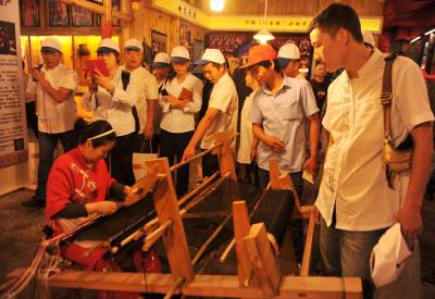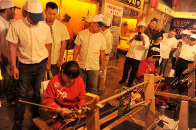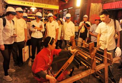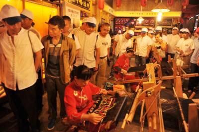 5月18日,在湖北省恩施土家族苗族自治州恩施市,驾驶员在恩施女儿城景区看土家西兰卡普的编织,体验土家民俗文化。(5月18日,在湖北省恩施土家族苗族自治州恩施市,驾驶员代表在《文明旅游倡议书》上签名。)