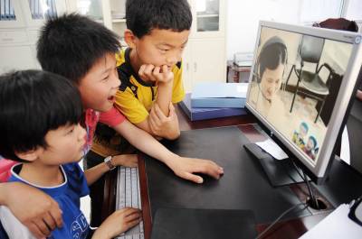 25日,铁山区建设路社区留守儿童陆安正与远在深圳打工的母亲视频聊天。在”六一”儿童节来临之际,该社区在社区办公电脑上安装摄像头,为留守儿童与在外地打工的父母搭建网络视频聊天平台,以解孩子们对父母的思念之情。