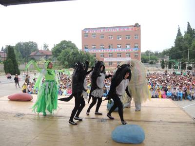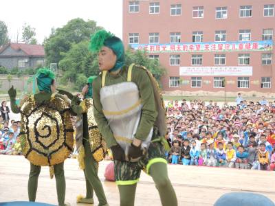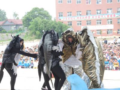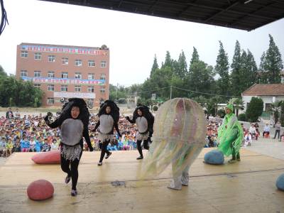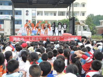 为丰富农村未成年人精神文化生活,孝感市文明办承办湖北省“七彩童年。快乐成长”公益演出孝感行活动。活动时间从5月21日至26日,武汉人民艺术剧院表演的儿童剧《小蝌蚪找妈妈》在全市7所小学演出。图为5月22日,剧院在云梦县胡金店镇中心小学操场演出。 通讯员 黄永强 王建红 摄 通联 云梦县胡金店镇政府 黄永强 电话 15971282503