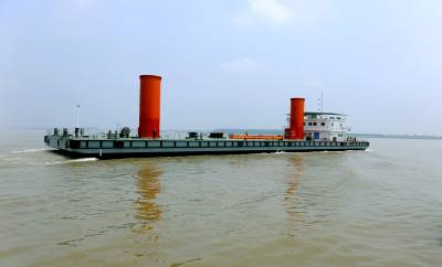 当日顺利登江的这艘双16t-35m浮式起重船为华能岳阳发电有限责任公司制造,系全回转式码头浮吊趸船,船上布置2台16t-35m浮式起重机,用于码头装卸作业。