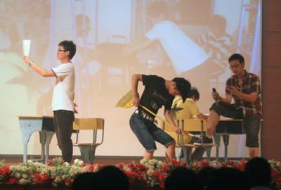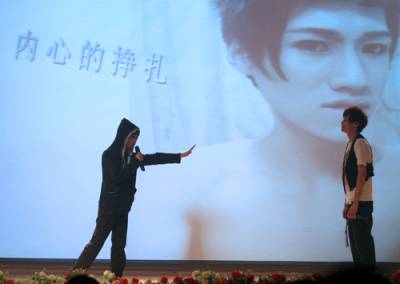 校园心理剧帮学生正确认识自我(组照12幅)5月25日,湖北科技职业学院举行校园心理剧演出,这是该校每年5月举办的心理健康教育月系列活动之一,也是广大同学们最喜欢的一种心理健康教育活动。校园心理剧是心理剧这种团体心理治疗方式在校园情境中的运用。它是把学生在生活、学习、交往中的心理冲突、烦恼、困惑等,以小品表演、角色扮演、情景对话等方式编成”小剧本”进行表演。在剧中,学生表演发生在他们身边熟悉的,甚至是亲身经历的事,从中体验心理的细微变化,进而达到渲泄、释压和领悟其中道理的目的,引导同学们树立正确的人格,从而正确地认识自我和发展自我。(朱垣摄)
