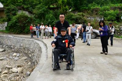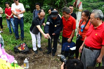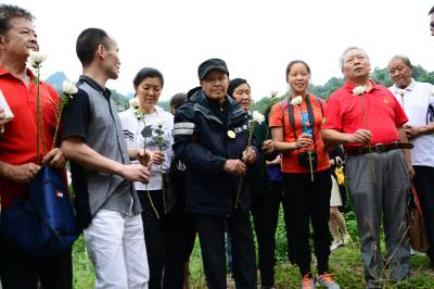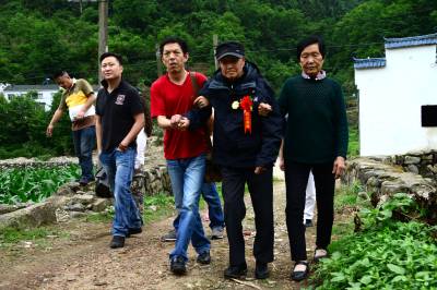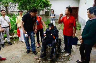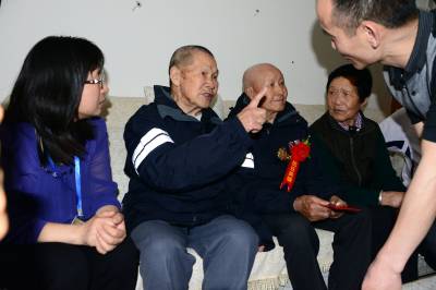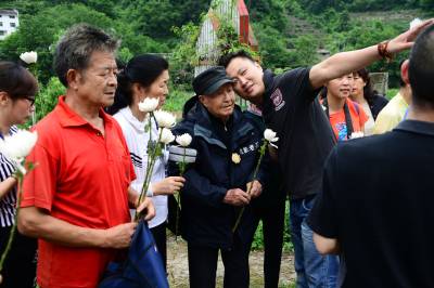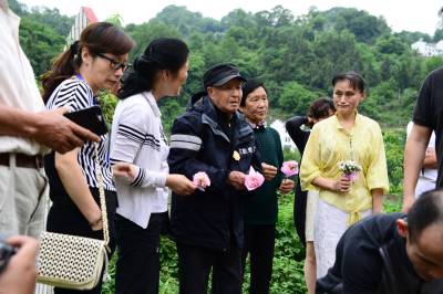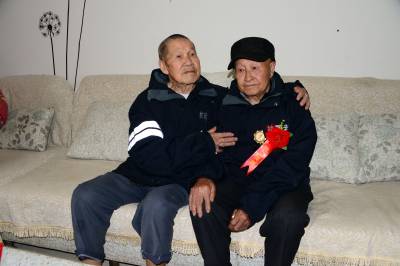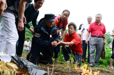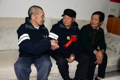 湖北武汉、荆州、宜昌三地关爱抗战老兵团队30多人,一路扶持,92岁的老兵踏访了夷陵区的南沱、张家口和晓峰南边村。在晓峰南边村,祭拜了掩埋在养老坪山坡上的3000多位抗日战士,之后在夷陵区梅岭新村拜会了老战友、原国军七十五军预四师第十一团五营的士兵张人源。两位老兵见面。眼噙热累。苍老的双手紧紧握在一起,峥嵘岁月难以言表。