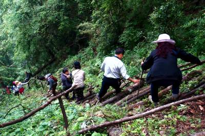 8650摄影班学员登上山途中不断检查蚂蝗是否入体。