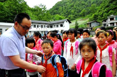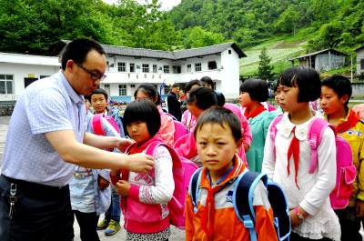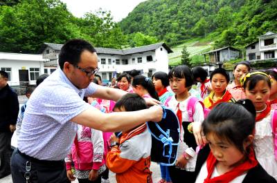 情系深山留守娃 5月27日,在恩施市红土乡大河沟村小学操场上,计生协工作人员正在给留守娃发新书包。 六一儿童节前夕,该乡计生协、计生办组织志愿者服务队开展“情暖童心•关爱留守娃”活动。为大河沟村小学80名留守儿童送去了书包,并为孩子们送来文化用品及体育器材,丰富当地留守儿童的校园生活,让孩子们欢欢喜喜过六一儿童节。(视界网彭绍峰黄平摄)