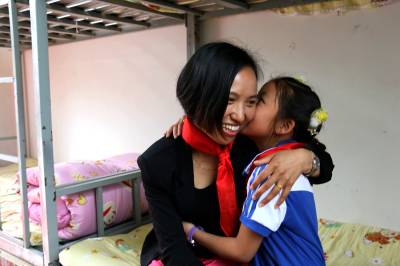 “阿姨,这衣服好漂亮,让我亲您一下。”5月28日,恩施市新塘乡木栗园小学留守儿童谭鑫萍穿上爱心校服后,抱住计生协会工作人员激动得亲了起来。