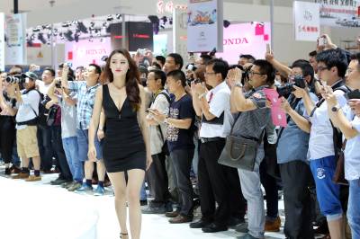 2015第十三届华中国际汽车展览会27日在武汉国博中心正式拉开帷幕,本周末将迎来人流高峰。图为车模在现场走秀。